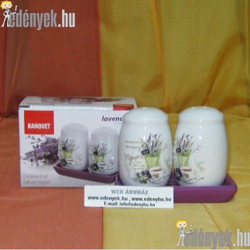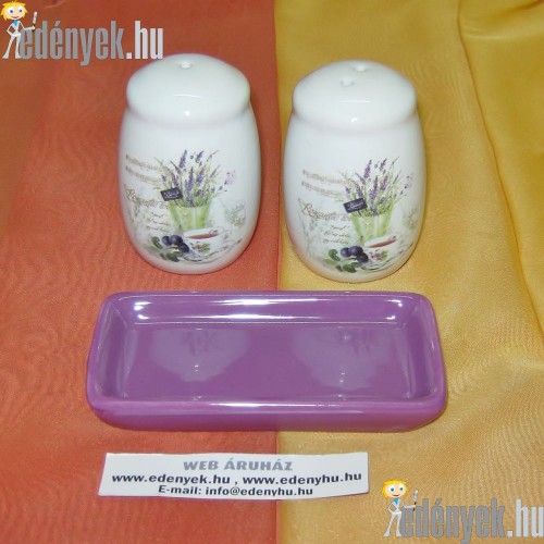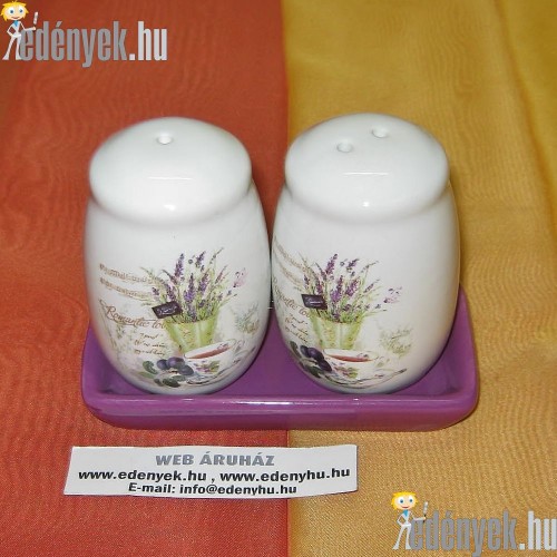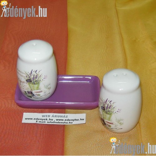 A kerámia levendula mintás sószóró, borsszóró BQT-381168 egy konyhai eszköz a só, a bors tárolására és szórására. Két különálló, gömbölyded henger alakú tároló edények szóró lyukakkal ellátva, egy tartó tálcán. A kerámia sószóró, borsszóró kaolinból (porcelánföldből, ami nem más, mint finomszemcsés összetevőkből álló üledék melynek a fő alkotóeleme a kaolinit) készült rideggé, keménnyé kiégetett belül üreges a konyhában és a vendéglátásban használatos eszköz.